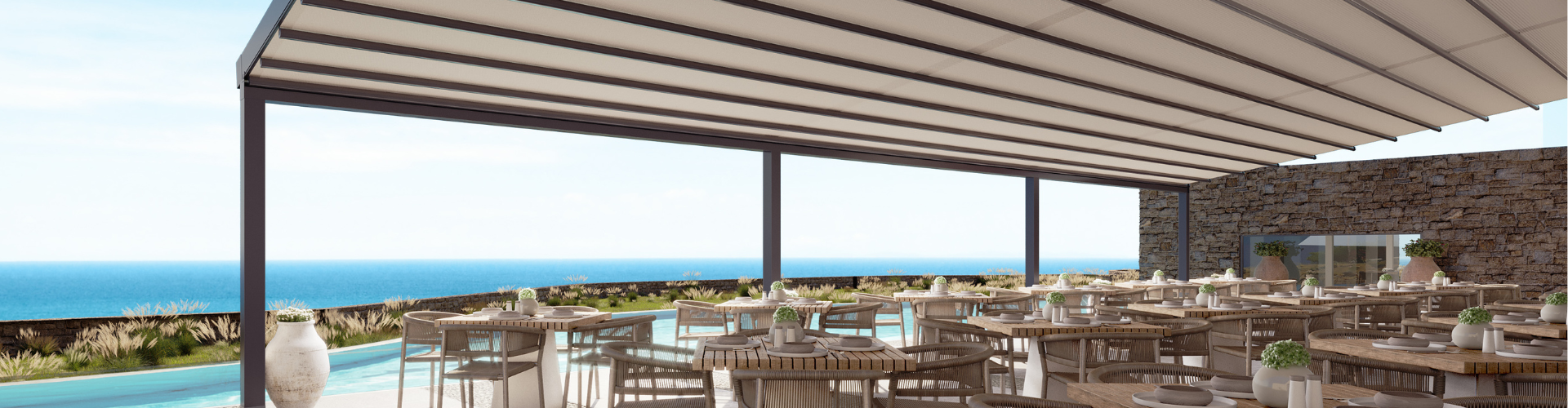 Het systeemontwerp is ontwikkeld in Griekenland, waar pergola’s al decennialang intensief worden toegepast in horeca en commerciële omgevingen. De productie en assemblage vinden plaats in Nederland, met grip op kwaliteit en levering.